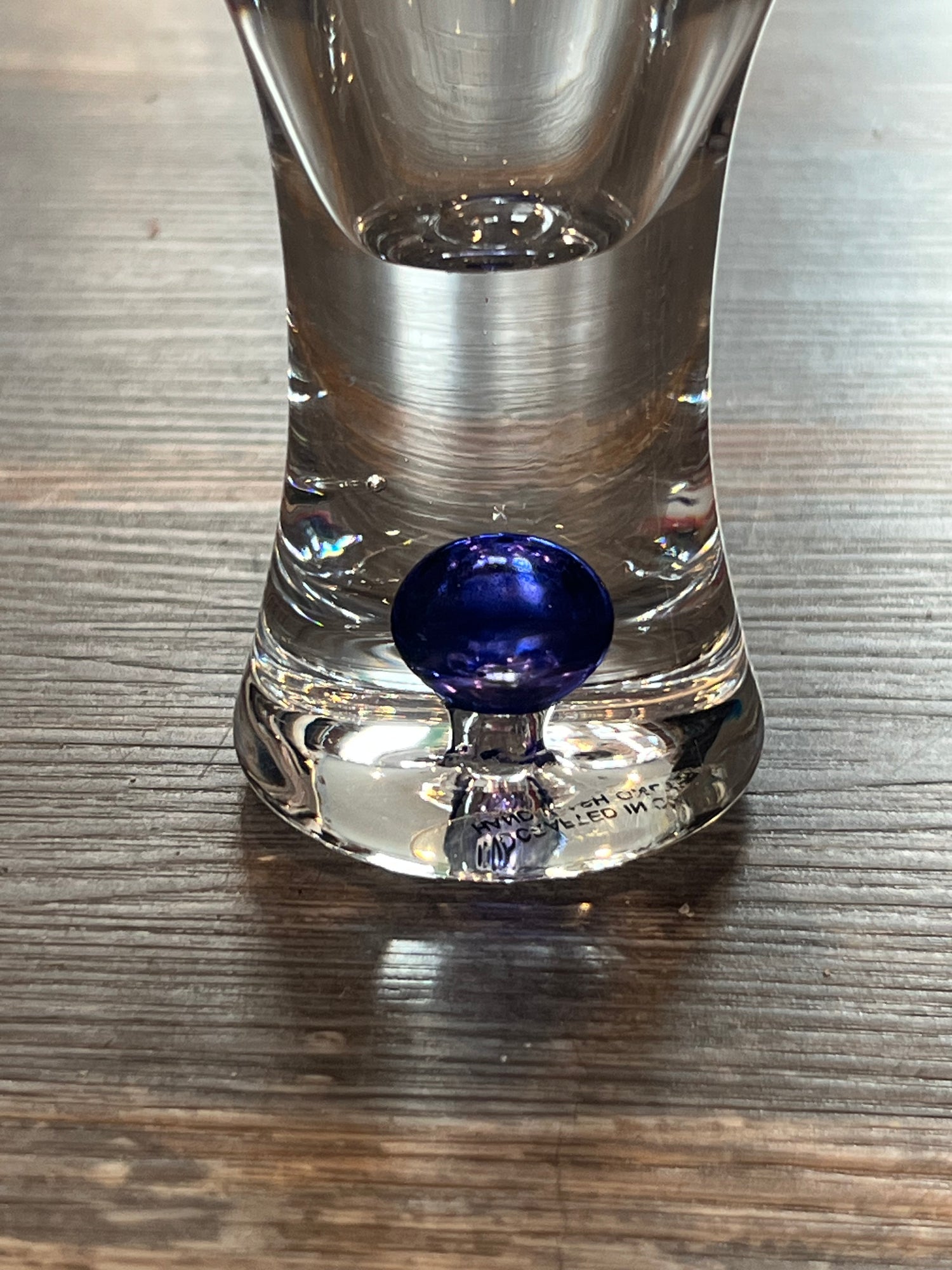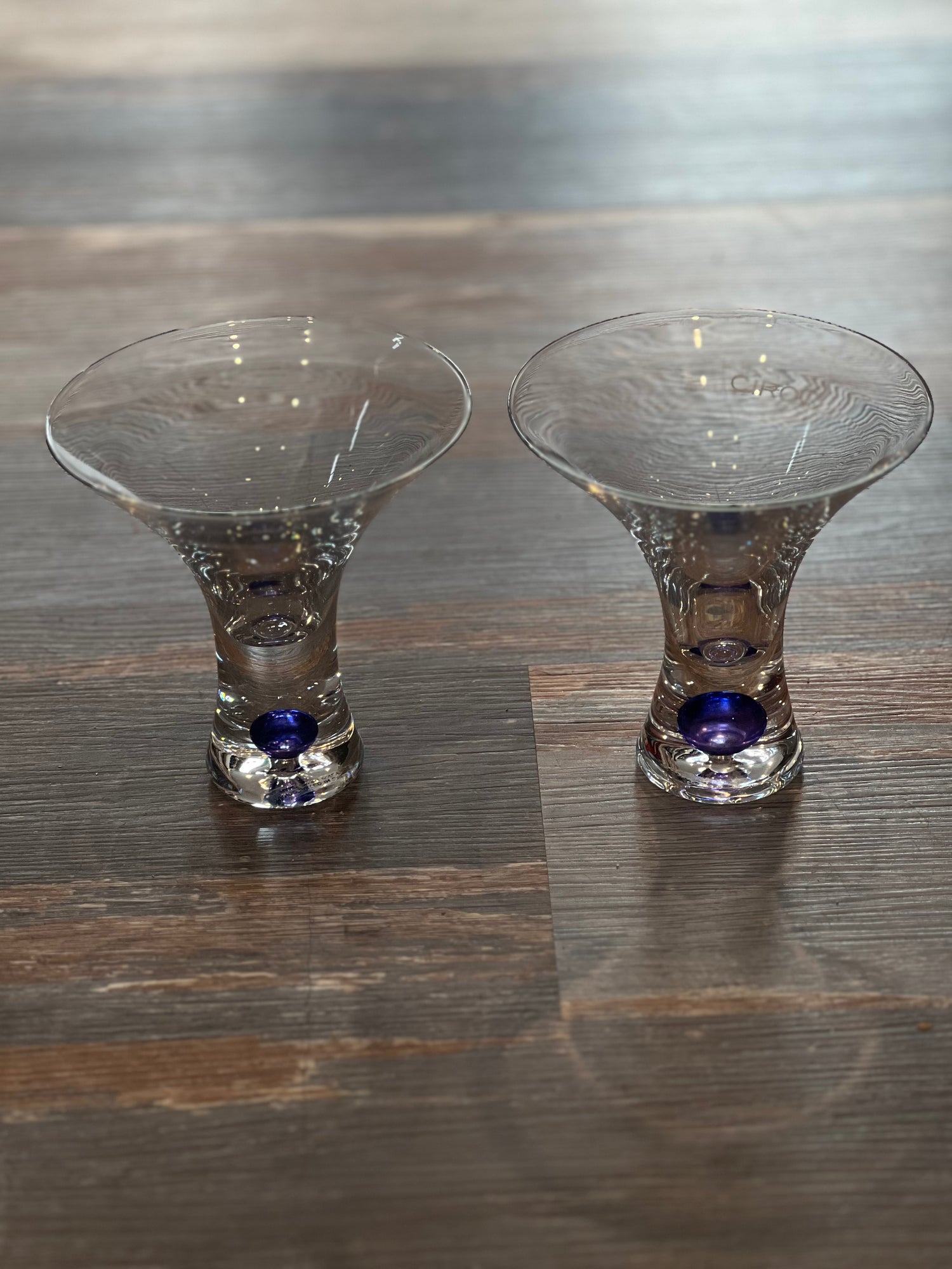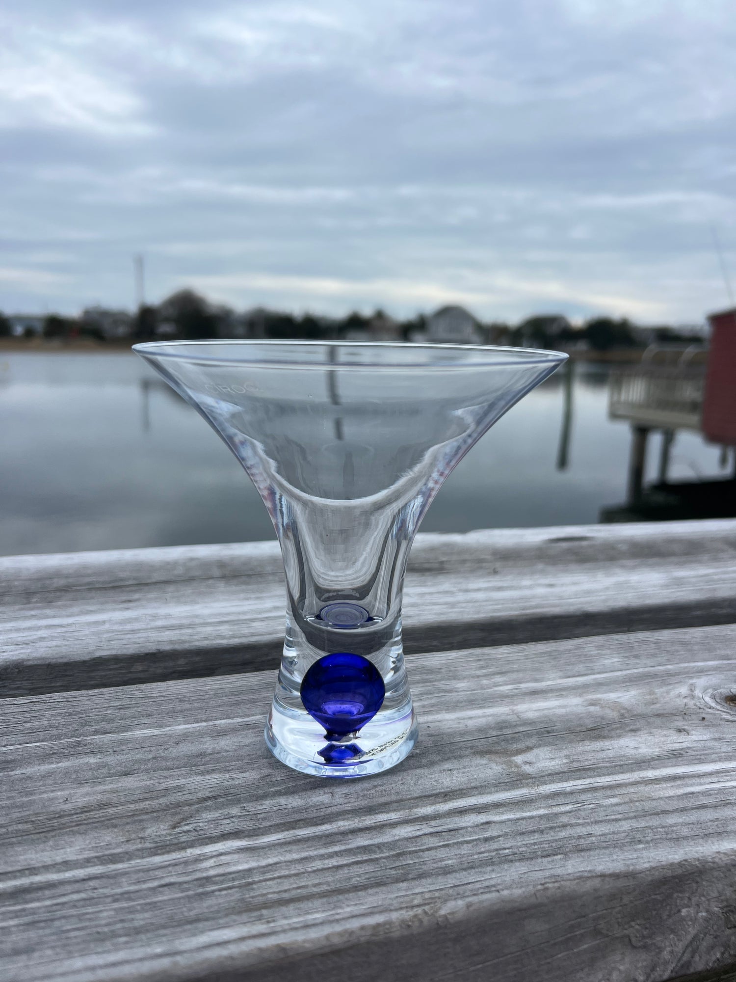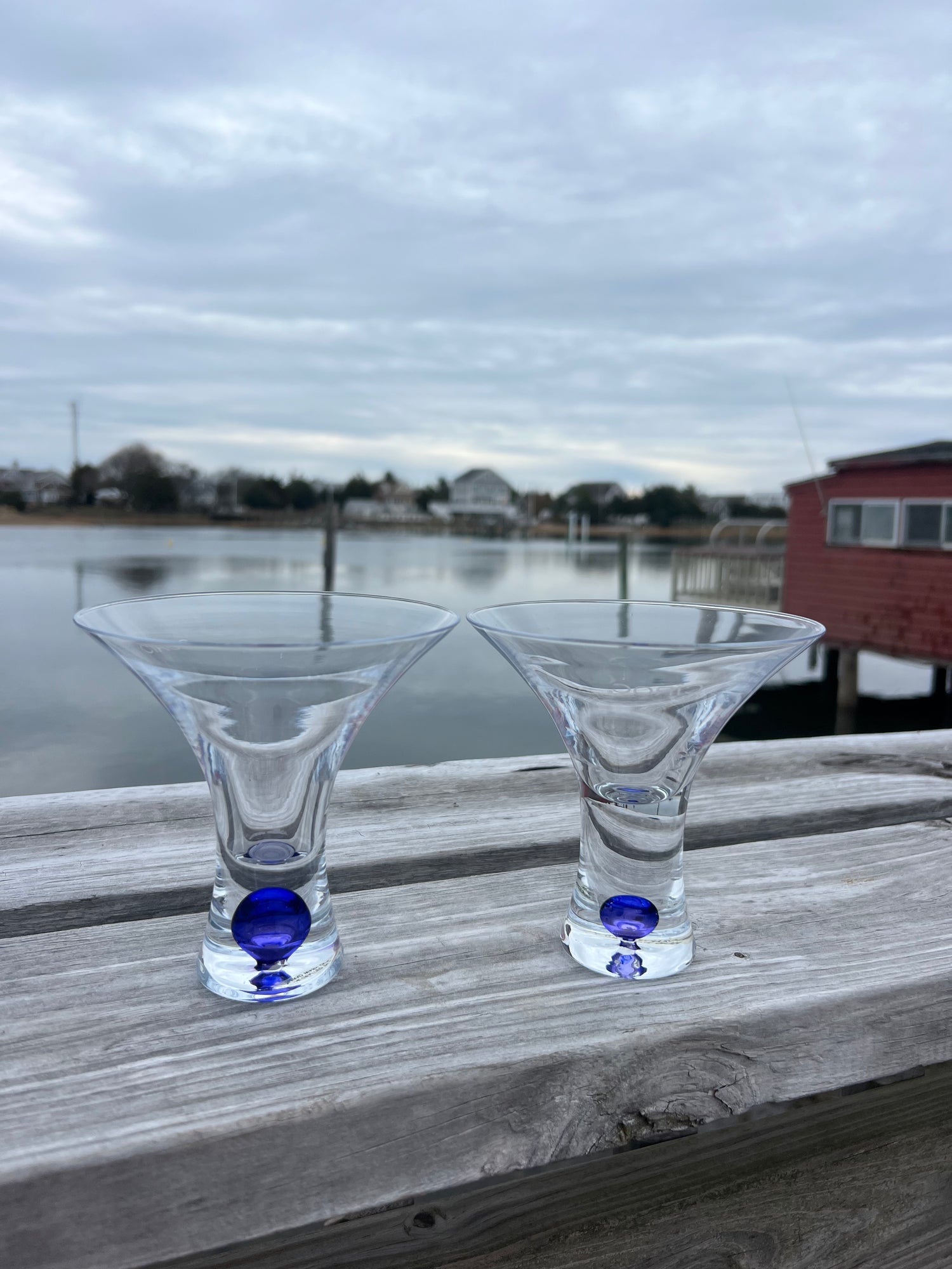 Elevate your table with these elegant handblown glasses, featuring a wide flared rim and a striking cobalt-blue glass bubble captured in the base. Their sculptural shape and crystal-clear finish make them perfect for serving cocktails or displaying as modern art pieces. A unique blend of craftsmanship and coastal-inspired style.