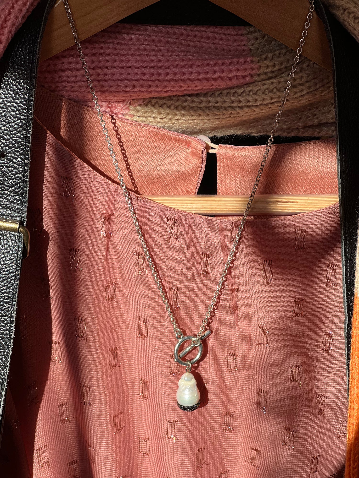 This handmade necklace includes a baroque pave pearl attached by a toggle clasp. The necklace comes in either gold or silver and includes gemmed accents to add a sparkle. 20” chain in either color.